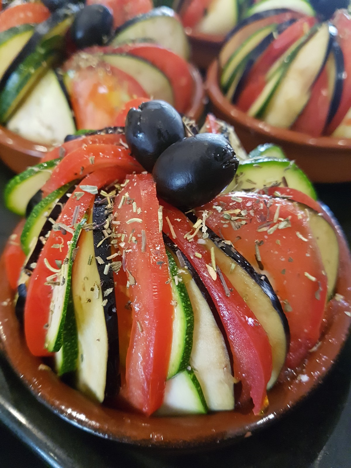 2. Evider le bois de chaque tomate, les poser à plat à l’envers et couper en tranches fines (<5mm) (une tomate par tian). 3. Couper l'aubergines en fines tranches (4 x 10 tranches de ~3 mm) 4. Couper la courgette en fines tranches (4 x 10 ou 20 tranches de ~4 mm, selon le diamètre de la courgette ) 5. Dresser: poser les 2 bouts de tomates sur les oignons pour faire un petit dôme, puis commencer à dresser: poser une rondelle d'aubergine du bord au centre, puis 1 ou 2 rondelles de courgettes (2 si petit diamètre, l'une par dessus l'autre, pour avoir la même hauteur que l'aubergine), puis une rondelle de tomate, et recommencer en tournant tout autour du dôme. Lorsque le cercle est rempli, soulever la première aubergine pour le fermer et glisser encore 2 séries. 6. Couvrir de la main et twister en pressant légèrement pour tout caler. 7. Saler et poivrer généreusement, et ajouter un bon filet d'huile d'olive et des herbes de Provence. 8. Poser une olive au sommet et enfourner 40 minutes à 160°C.